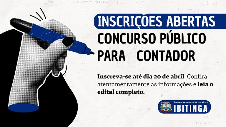 A Câmara Municipal da Estância Turística de Ibitinga abriu inscrições para o Concurso Público nº 01/2026, destinado ao preenchimento de uma vaga para o cargo de contador. O edital prevê salário de R$ 6.916,83, com carga horária de 40 horas semanais, além de benefícios previstos em lei.