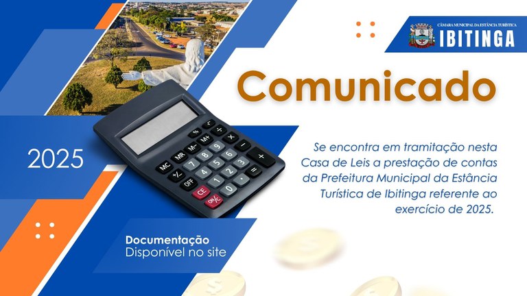 O Presidente da Câmara Municipal da Estância Turística de Ibitinga, COMUNICA que se encontra em tramitação nesta Casa de Leis a prestação de contas da Prefeitura Municipal da Estância Turística de Ibitinga referente ao exercício de 2025.