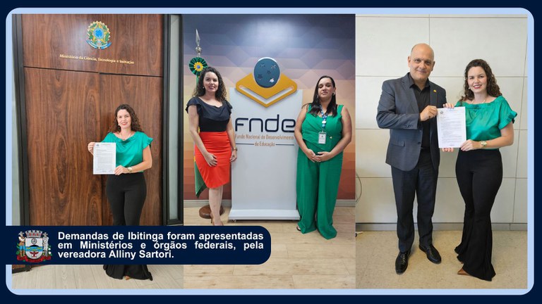 Em agenda oficial realizada em Brasília (DF), a vereadora Alliny Sartori, representou a Câmara Municipal de Ibitinga. Na ocasião, foram protocolados uma série de documentos e reivindicações voltadas a melhorias na infraestrutura, saúde e educação do município. As solicitações foram encaminhadas diretamente a ministérios e órgãos federais, visando a captação de recursos para a Estância Turística.