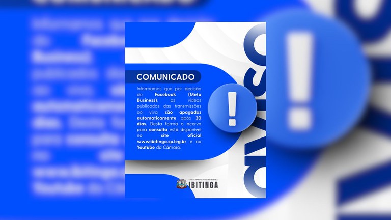 As transmissões ao vivo da Câmara Municipal de Ibitinga com mais de 30 dias de publicação na página oficial do Legislativo no Facebook serão excluídas automaticamente. A medida é decorrente de uma atualização na política de armazenamento de vídeos da própria plataforma e não depende de decisão da Câmara.