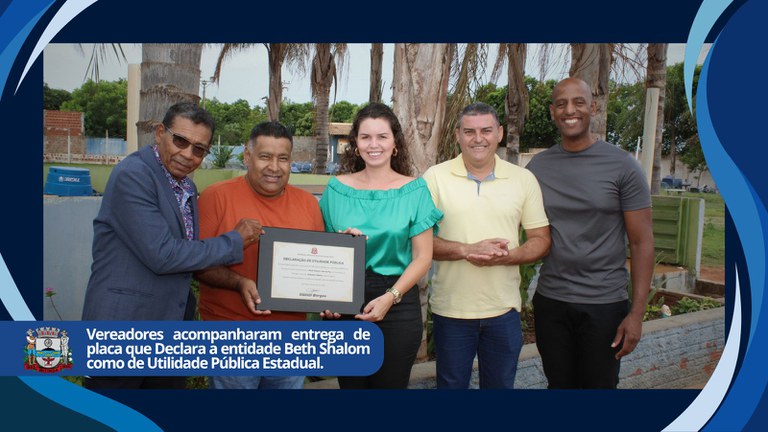 Na manhã desta sexta-feira (12), os vereadores José Nilson, Alliny Sartori, Ricardo Prado e Célio Aristão estiveram na entidade Beth Shalom para oficializar a entrega da placa que reconhece a instituição como de Utilidade Pública Estadual.